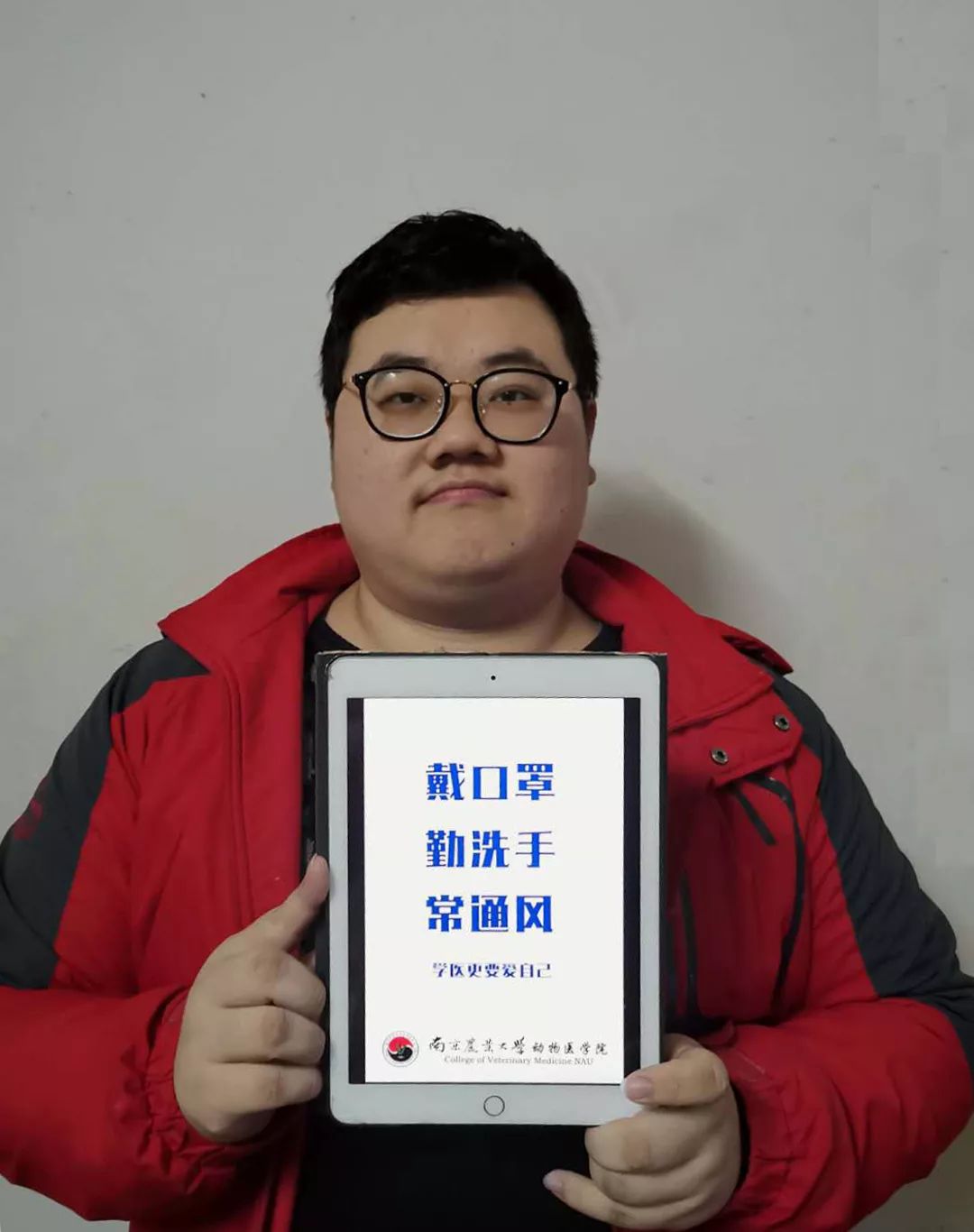 学生团委副主席 徐浩然:疫情面前,我们要保持好心态,重防护、勤消毒,减少出门和聚会,保护好自己和家人,一起共渡难关。同时,向一直奋斗在一线的医护人员致敬,你们辛苦了,武汉加油,中国加油!
