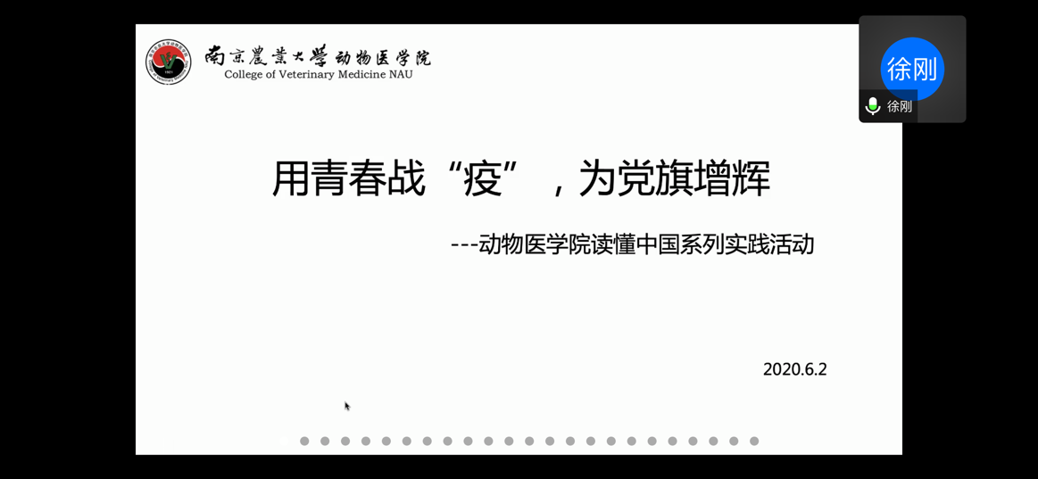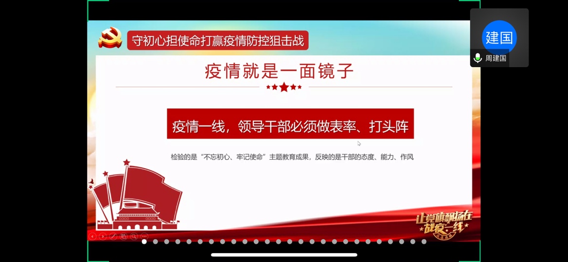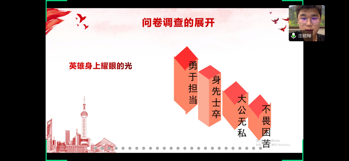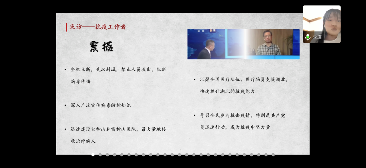 6月2日晚上18:00时许,我们“用青春战‘疫’,为党旗增辉”读懂中国系列活动在线上进行最后的展示。本活动以“抗击疫情”为主题,分成影片观赏和调查采访两个部分。初级党建班同学被分为12组,通过前期观看影片记录感受、分发调查问卷、线上线下采访,最终进行线上分享会,为全体师生上了一堂别出心裁的党课。