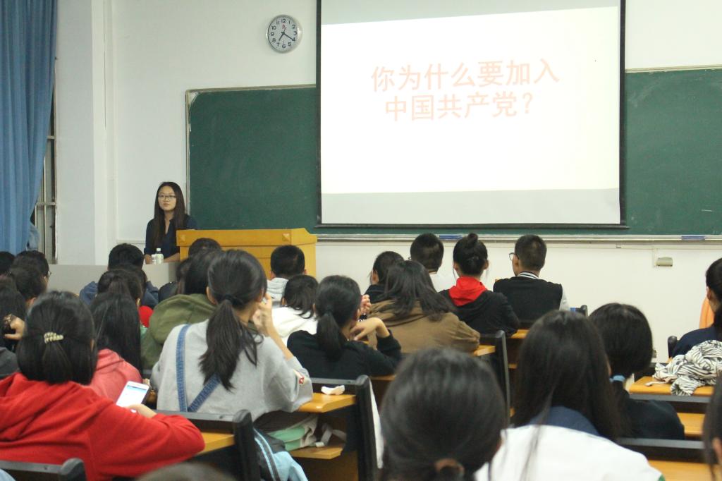 活动开始,辅导员金洁南老师通过向同学们提问谁想加入共产党,为什么加入共产党展开介绍,简要说明我们党支部组成,入党的流程。金洁南老师强调成为党员过程的严格性,发展党员每个环节的必要性,以及同学们在本科期间入党的便利性。辅导员表示同学们要以积极平和的心态去看待自己入党的问题,要将自己与国家放到一起来看待一些社会问题,最后还希望同学们珍惜在大学入党的机会。