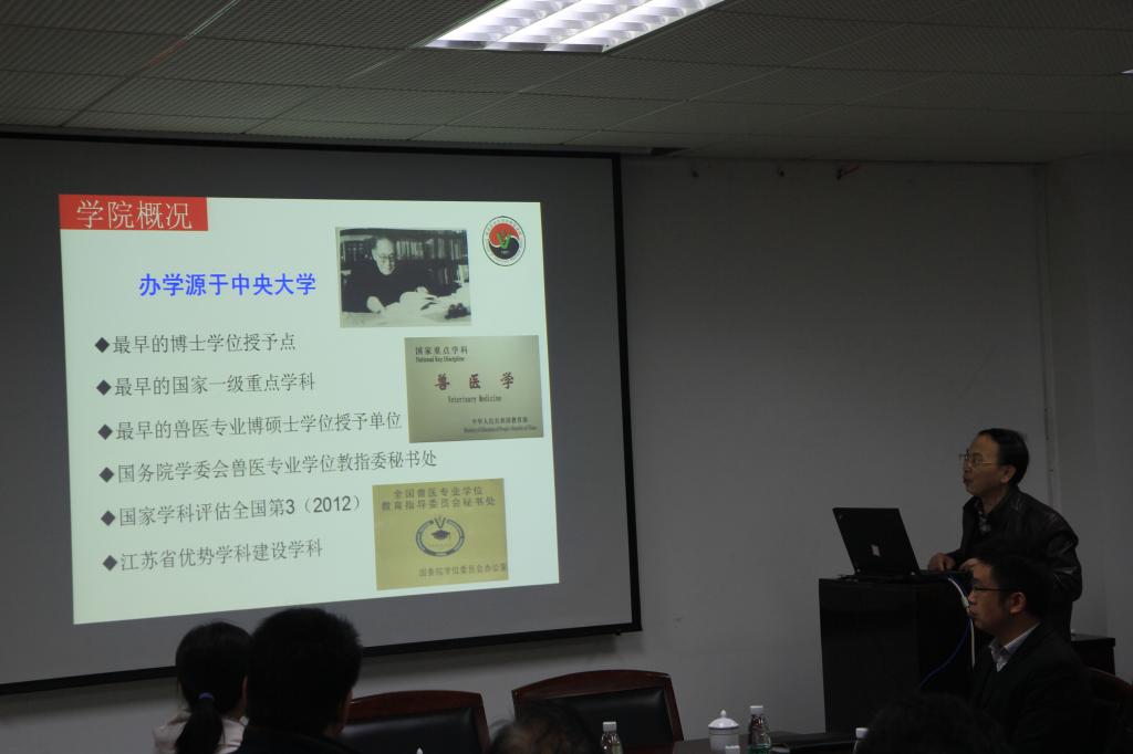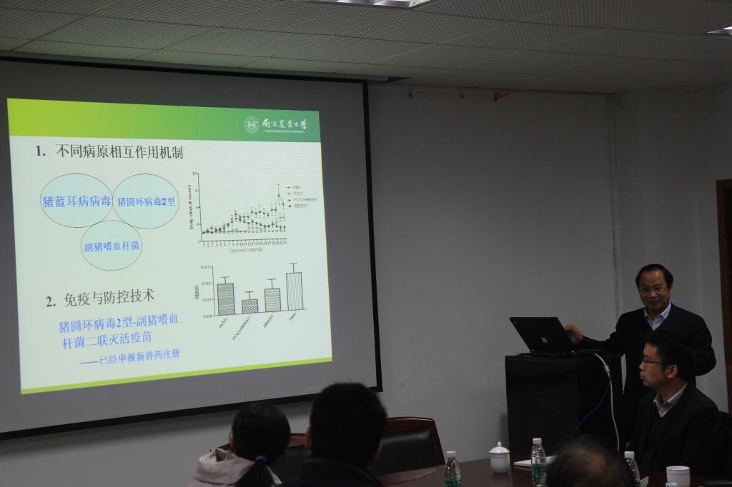 在随后召开的教授座谈会上,院长周继勇教授首先就我们的发展历史、学科状况、科研基地平台、“十二五”期间的科研情况进行了汇报。随后,基础兽医学系主任赵茹茜教授、预防兽医学系主任姜平教授、临床兽医学系主任黄克和教授分别汇报了各系的师资队伍、“十二五”科研成果及其研究特色。听完汇报后,两位领导对我们取得的科研成绩给予了充分肯定,并就我们的科研工作给予了指导,同时介绍了国家科技体制改革的情况、政策、动态以及重点研发计划情况,希望我们整合优势资源,积极申报相关重点研发专项项目。