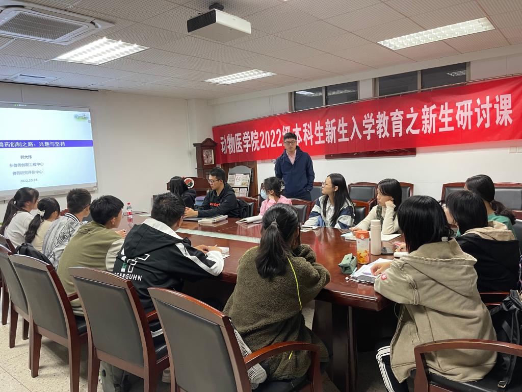副教授郭大伟以“走上新兽药创制之路:兴趣与坚持”主题展开此次新生研讨课。研讨中,郭老师以自身经历为切入点,鼓励同学们培养独立思考的能力,而不是做只会执行固定路线的机器人。并详细讲解了对于新兽药的多种评价、新药研发历程,并拓展讲解兽药市场的发展、学院动药研究方向,强调多读文献、培养思维的重要性。