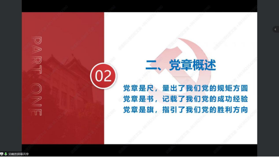 在党章概述部分,吴峰详细介绍了什么是党章以及党章的功能地位,让入党积极分子对党章有了进一步的了解。