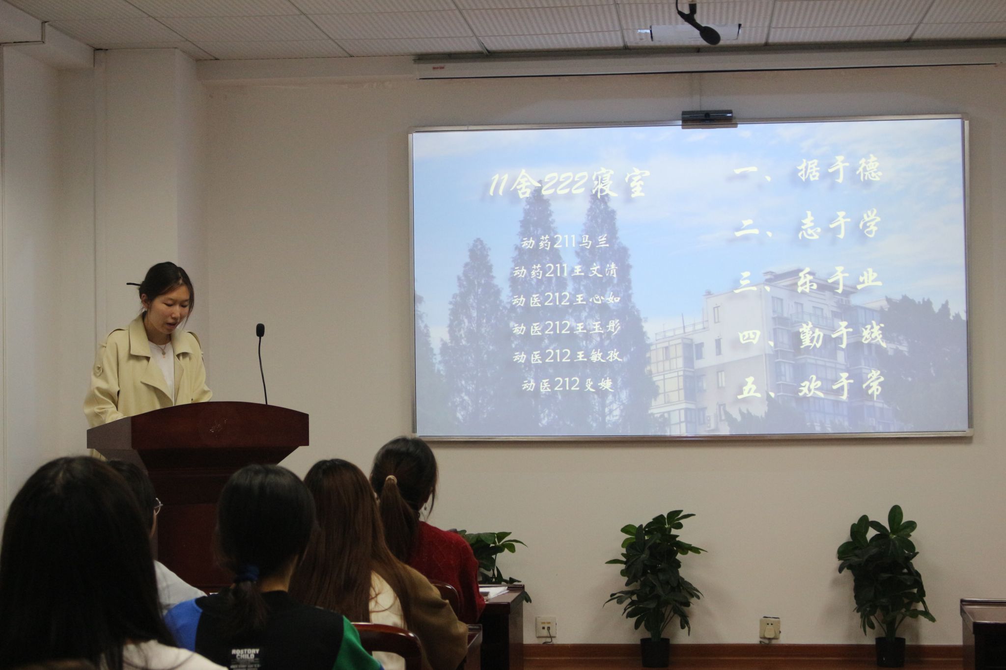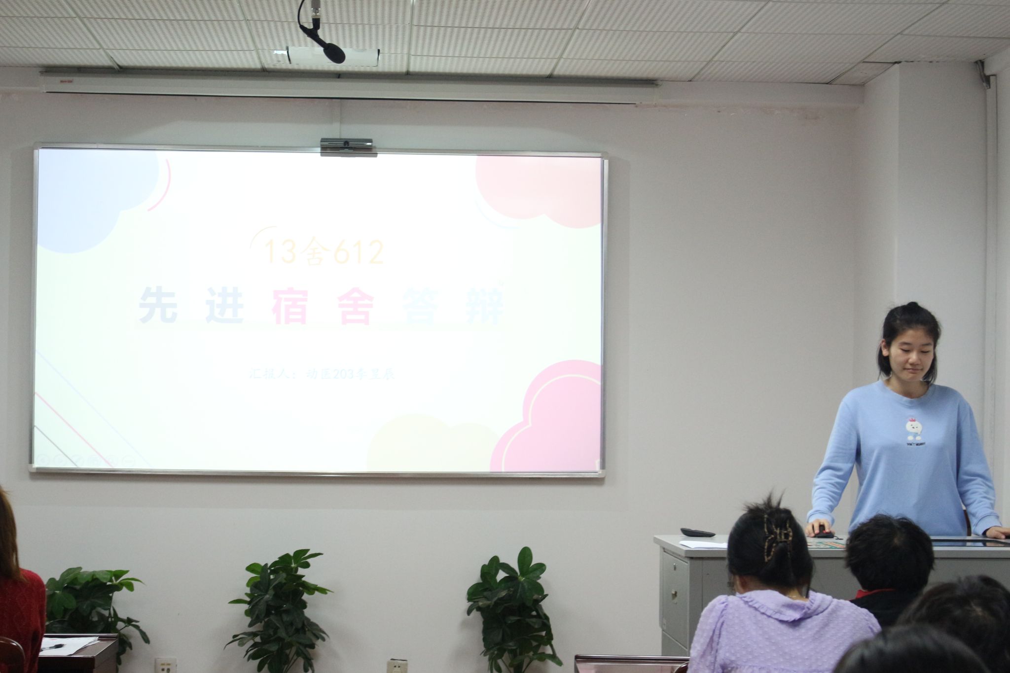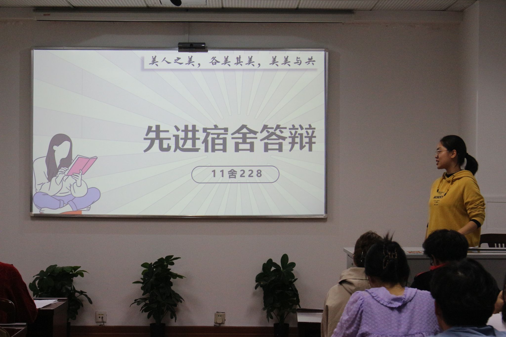宿舍代表们依次自由讲解、展现她们各具特色的寝室风貌。本次参赛宿舍从其成员概况,学习情况,志愿服务,获奖情况等方面进行了详细讲解,充分展示了互帮互助、积极向上的寝室氛围,和谐友好的宿舍关系,积极响应了文明、先进宿舍建设的号召。
