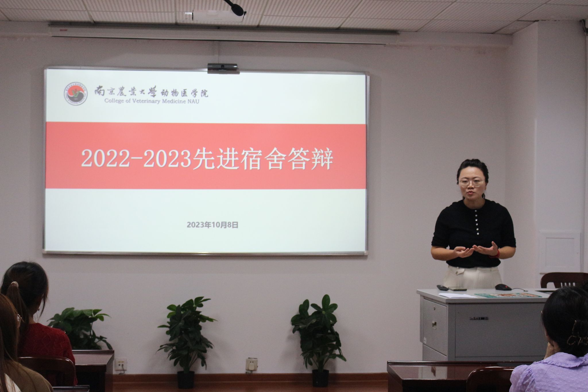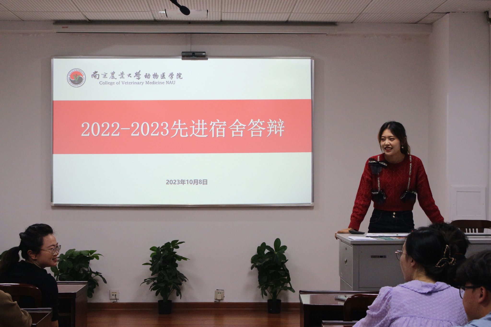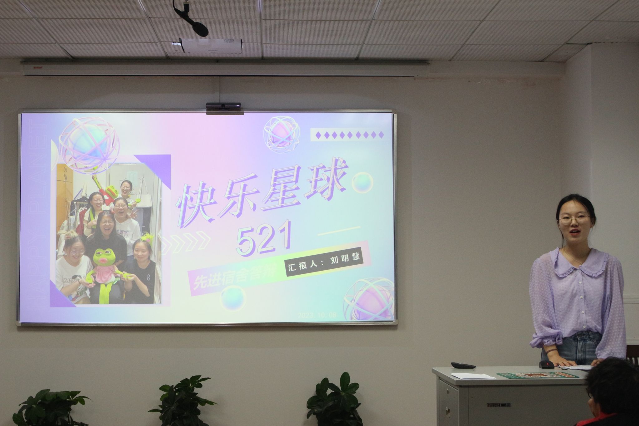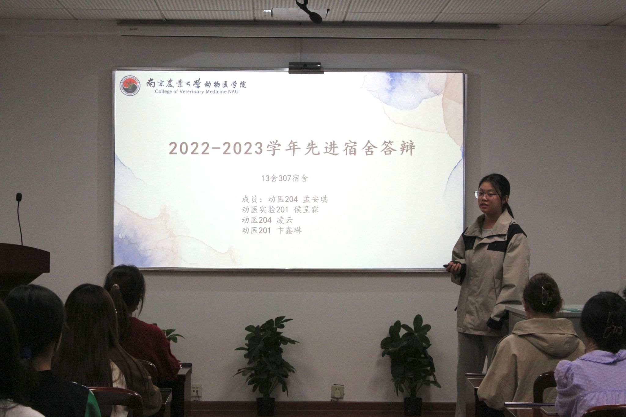 宿舍代表们依次自由讲解、展现她们各具特色的寝室风貌。本次参赛宿舍从其成员概况,学习情况,志愿服务,获奖情况等方面进行了详细讲解,充分展示了互帮互助、积极向上的寝室氛围,和谐友好的宿舍关系,积极响应了文明、先进宿舍建设的号召。