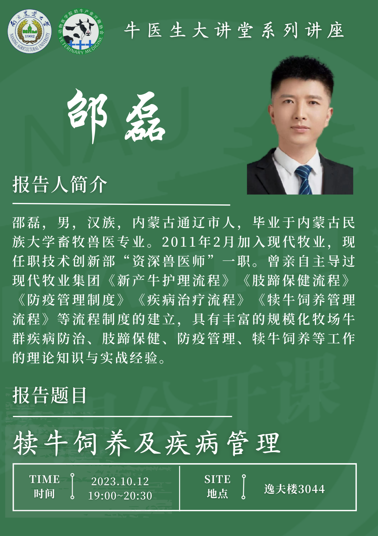 10月12日晚,伟德betvlctor体育官网2023年“牛医生”训练营首期报告在逸夫楼3044顺利举行,现代牧业集团资深兽医师邵磊受邀开展《犊牛饲养及疾病管理》主题讲座,80余名学员通过线上直播参与讲座。活动由伟德betvlctor体育官网奶牛产业兴趣协会主办。