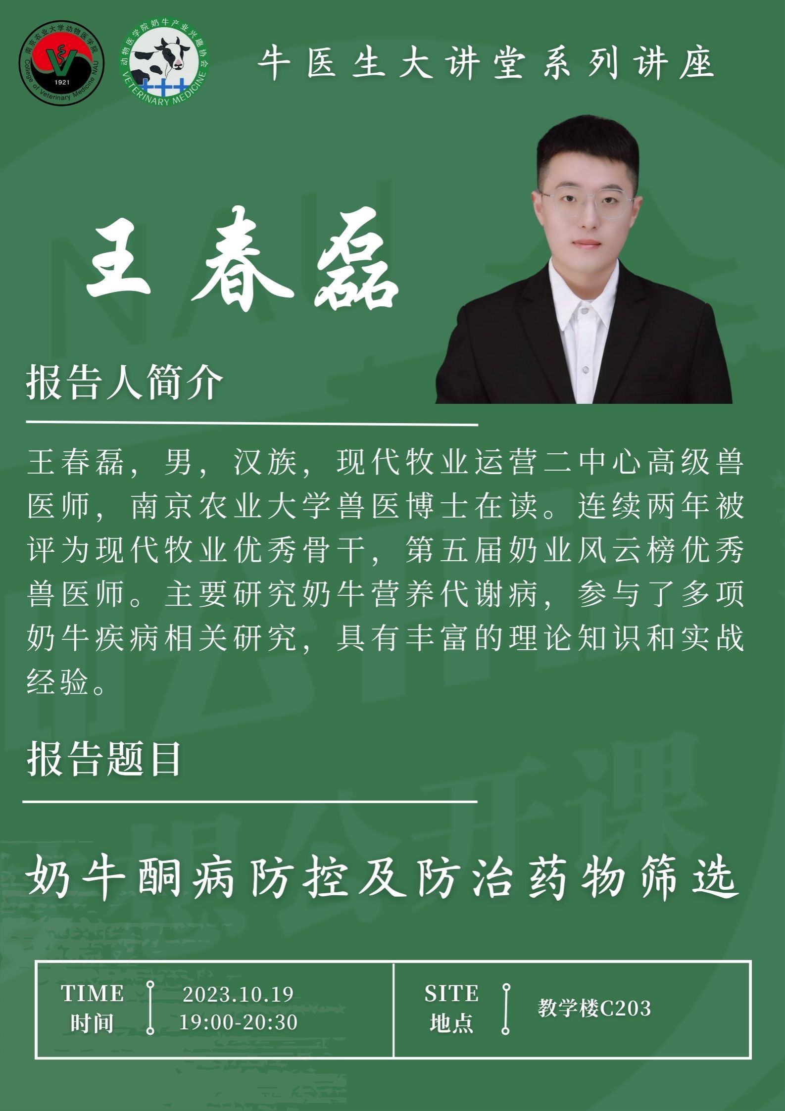 10月19日晚,伟德betvlctor体育官网2023年“牛医生大讲堂”专题培训第二期在教学楼C203如期举行。本次培训主题为“奶牛酮病防控及防治药物筛选”,由现代牧业集团高级兽医师王春磊主讲,吸引了百余名学生参加。