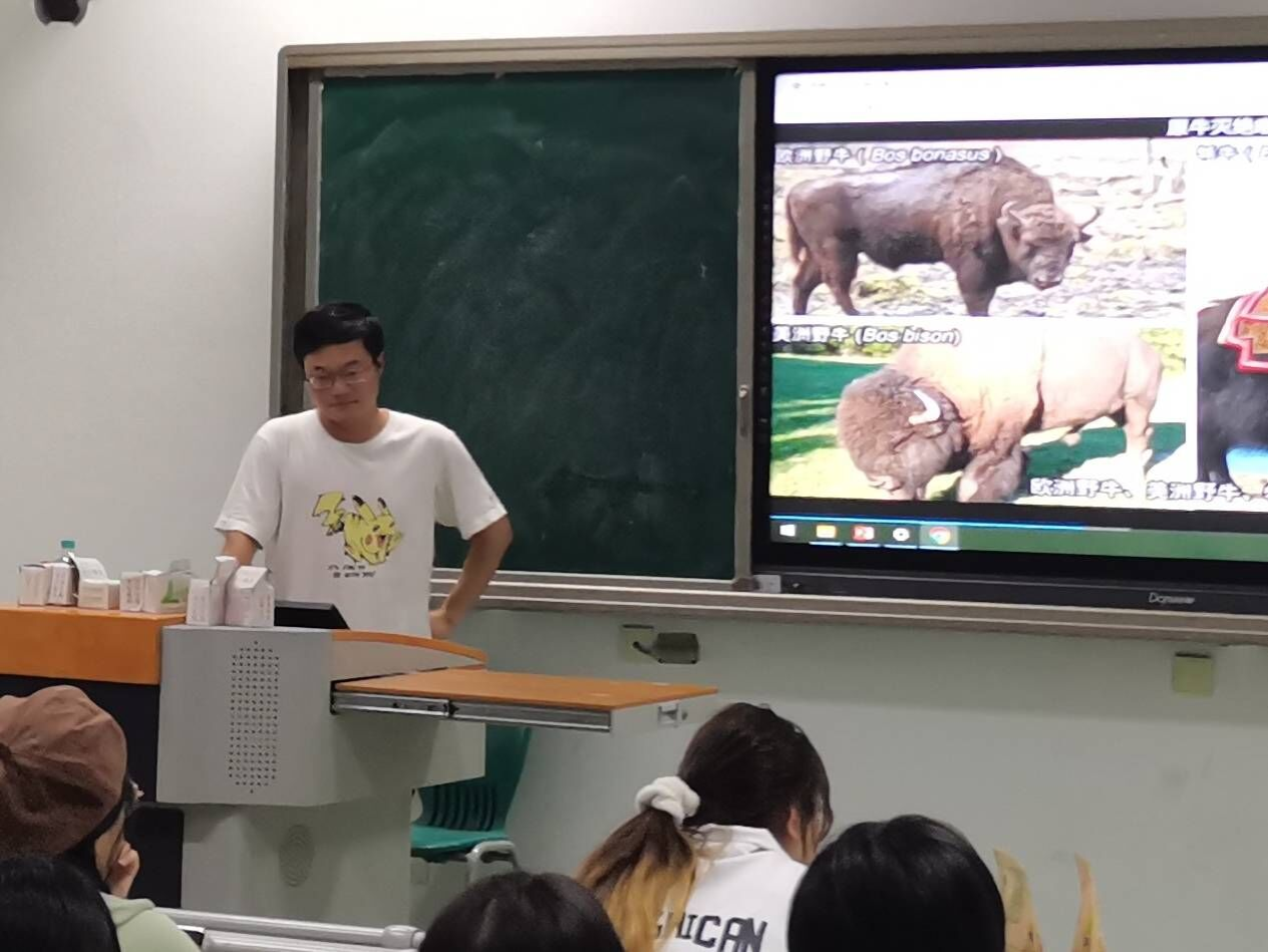 李坤以“牦牛与藏文化”为主题,带领同学们初步了解牦牛与藏族文化。以西藏特产——牦牛肉干作为导入,给同学们介绍了藏族美食、风景,又通过视频让同学对于牦牛有一个初步的认识:牦牛的分类以及进化历史,牦牛与藏文化息息相关,“藏族人驯化了牦牛,牦牛养育了藏族人”。李坤提到牦牛产业遇到的问题以及方展方向,详细介绍了藏文化的发展历史、信仰的宗教、藏族文字的起源等。
