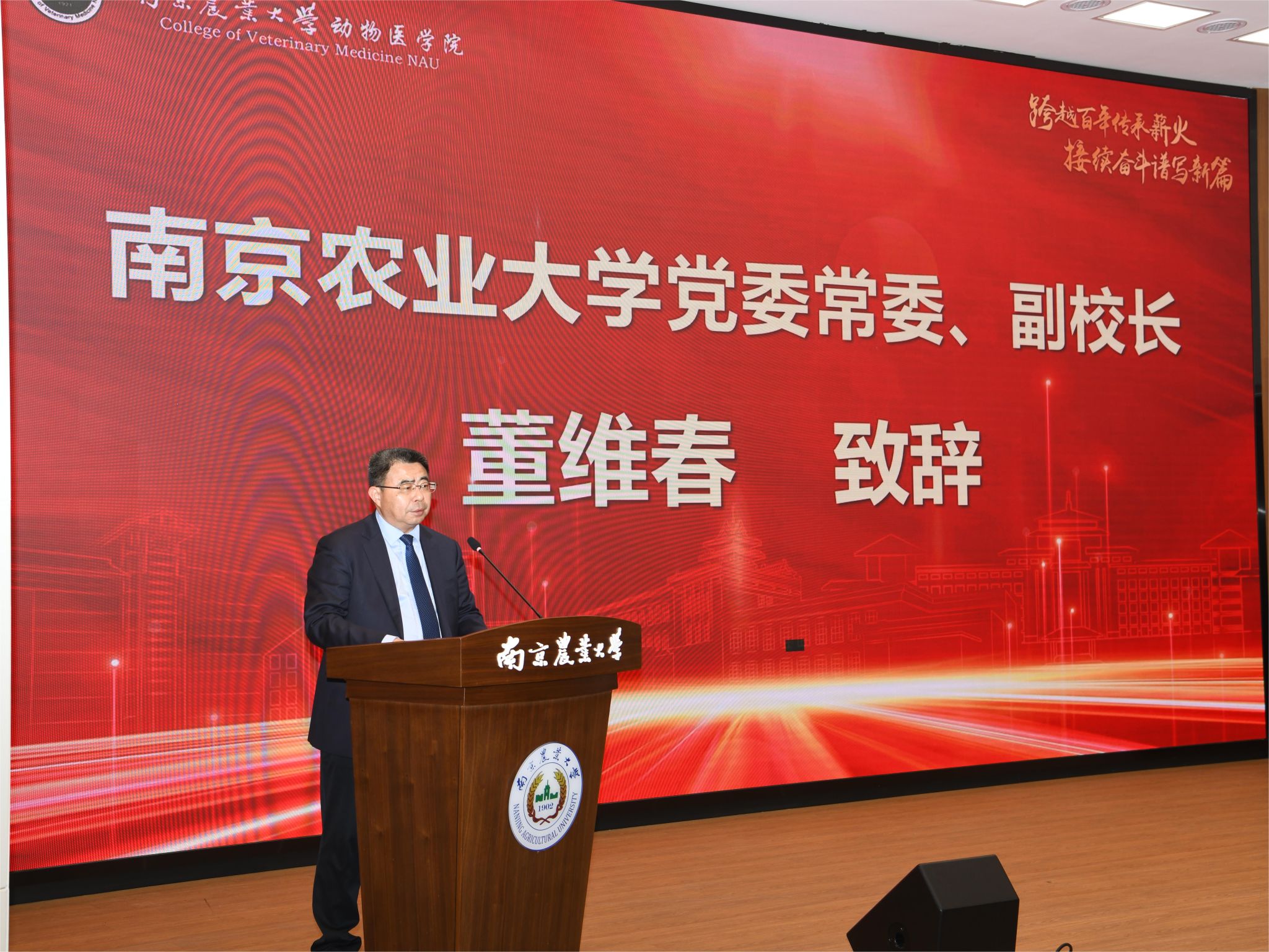 董维春代表学校致辞,他全面介绍了罗清生在教育教学、科学研究、人才培养等领域作出的突出贡献。他指出,正是有罗清生先生等一代代南农兽医人的弦歌不辍,薪火相传,才有了学院的发展成就。他希望,广大青年兽医学子要坚定信仰,用“青春之力”促进中国兽医事业传承发展;要勤于求知,以“青春之笔”绘好中国兽医事业未来画卷;要投身实践,以“青春之姿”走好中国兽医事业奋进道路。