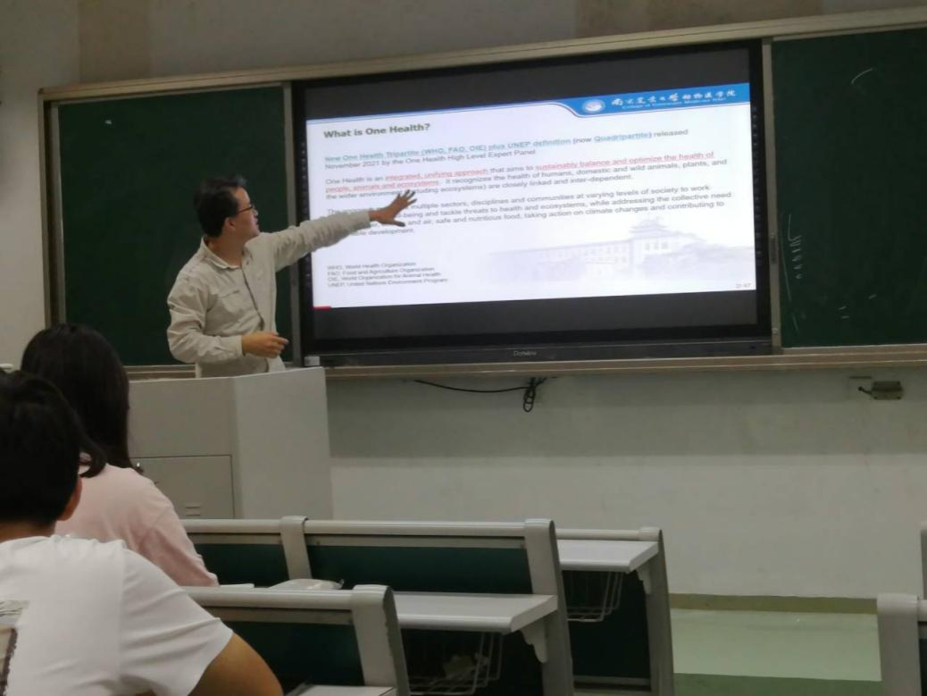 Yong Sam Jung以“什么是One Health”为主题展开了本次的新生研讨课。他以新冠肺炎为引例,指出在如今全球化背景下,公共卫生已经不再局限于某个单一行业,进而引出对“One Health”(同一健康)这一理念的阐述,从什么是“One Health”、为什么联合国需要提出并贯彻“One Health”这一理念、目前“One Health”理念实施存在的阻力与挑战、南农在“One Health”方面的全球贡献等角度展开,点明兽医在“One Health”理念下的重要作用。