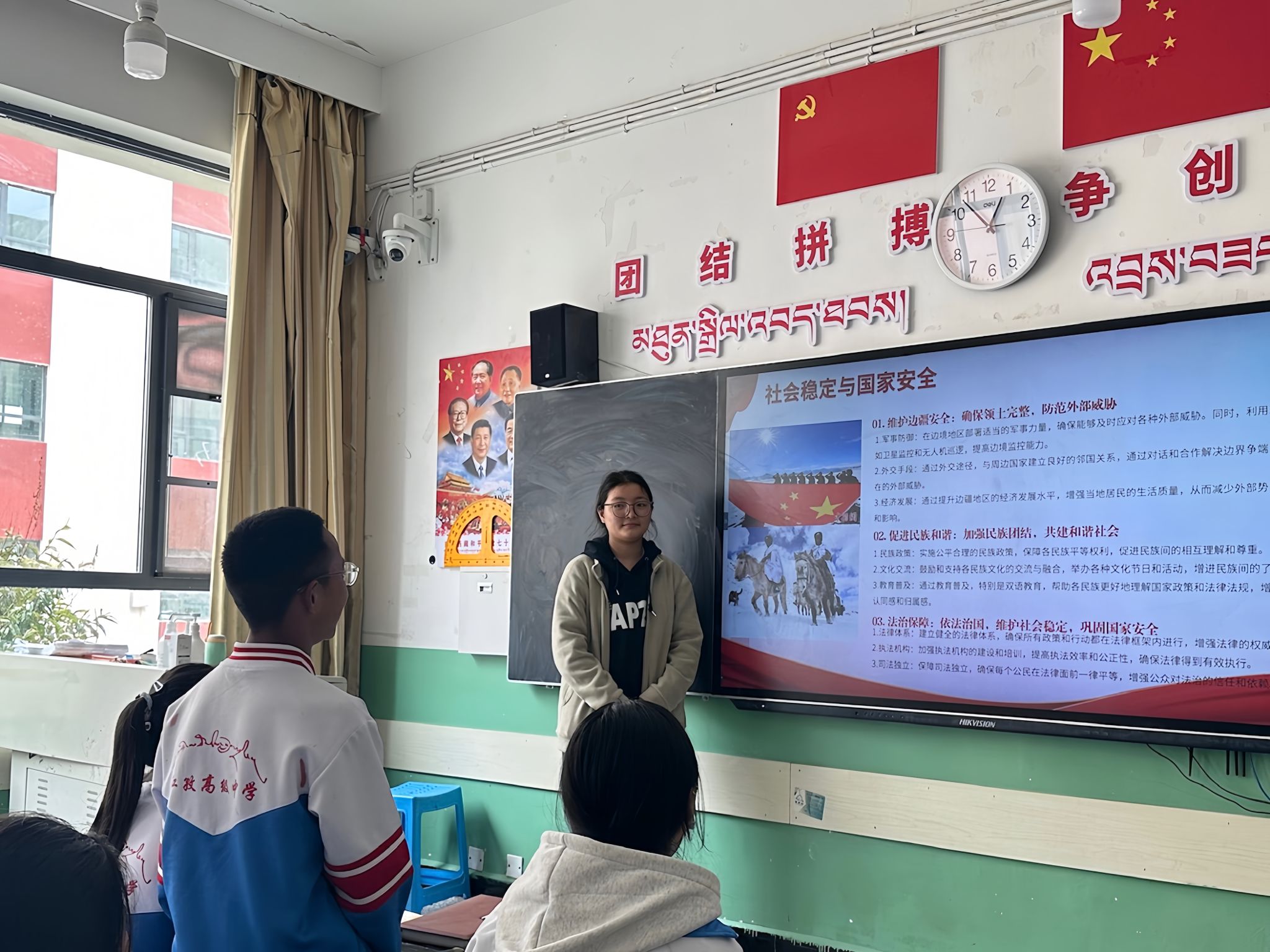 宣讲伊始,团队成员向学生们介绍了西藏红色基因的丰富内涵,强调了红色基因在西藏历史发展中的重要作用。他们讲述了西藏在中国共产党领导下取得的一系列辉煌成就以及西藏人民在革命和建设中展现出的英勇与智慧。通过西藏和平解放、民主改革等真实的历史事件,学生们深刻理解了红色基因的传承对于西藏乃至整个中国的重要意义。