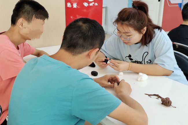 手工互动是最受学员们喜爱的环节。志愿者们为学员们发放彩色超轻粘土,陪伴并协助他们一起用粘土捏出《阿凡提的故事》中受大家喜爱的小毛驴。志愿者们在旁耐心指导,手把手引导学员如何塑造小毛驴的形态和细节。在手工制作过程中,学员们都表现出了极大的兴趣和热情,认真观察志愿者的示范,仔细捏制小毛驴的每一个细节;发挥自己的创造力,为小毛驴添加了各种有趣的装饰。志愿者们在一旁给予及时的帮助和鼓励,帮助他们完成自己的作品。