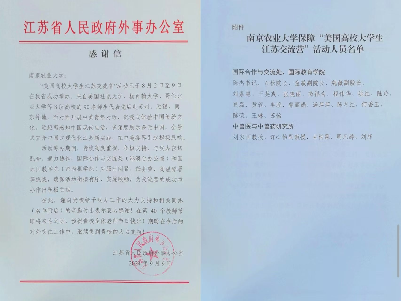 近日,我们刘家国教授和许心怡副教授因在江苏省国际合作交流中作出的突出贡献,荣获江苏省外事办公室(省外办)发来的感谢信。这封感谢信高度赞扬了两位教授在推动国际学术合作、促进国际间交流以及提升江苏省国际影响力方面的卓越贡献。