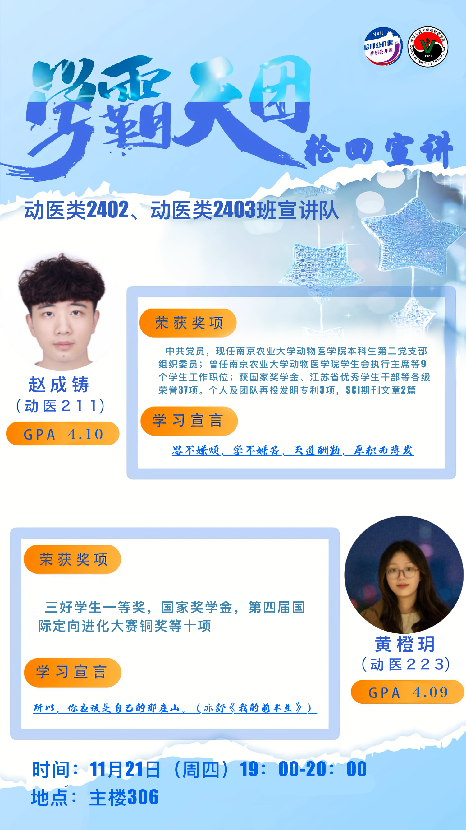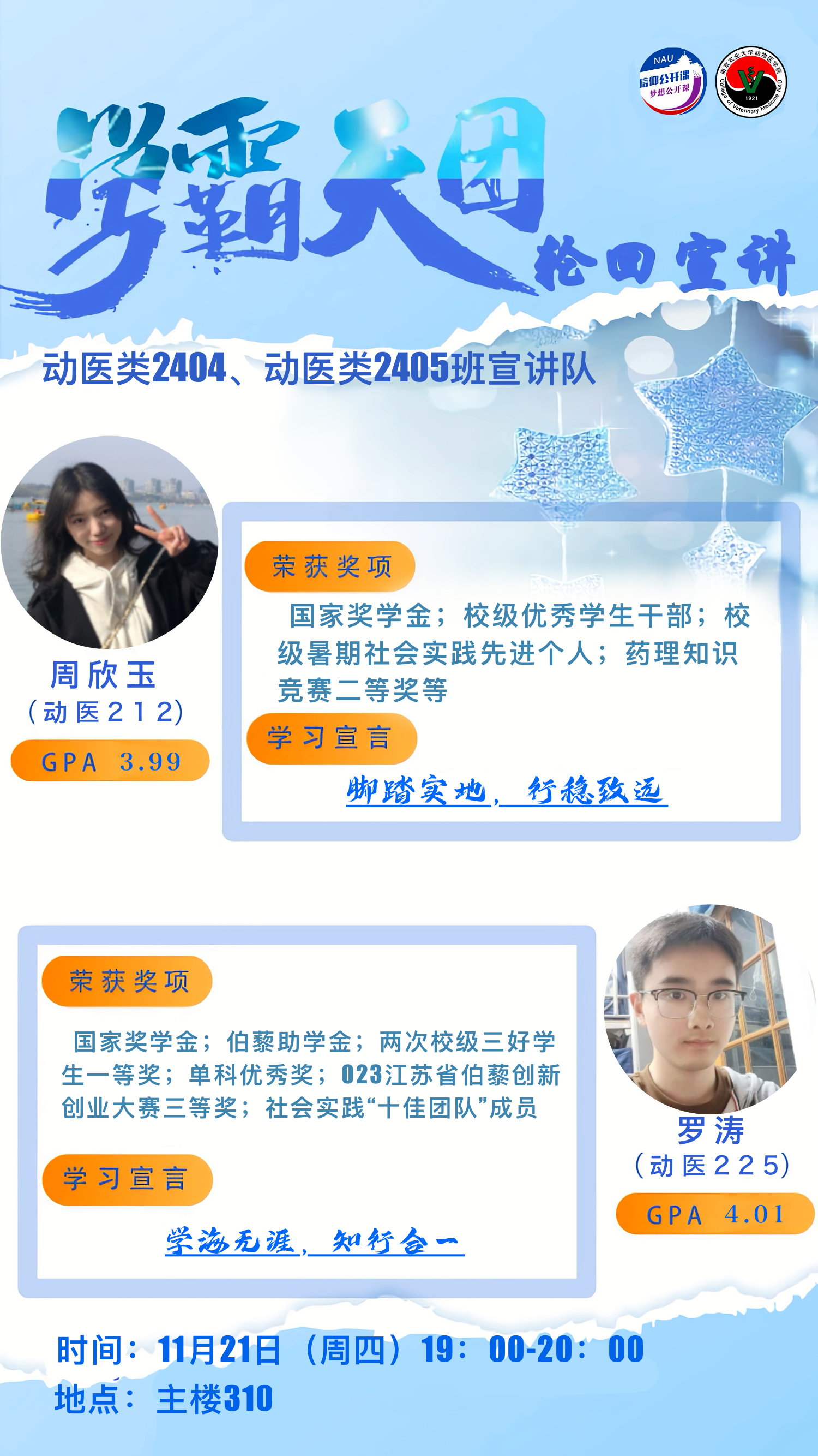 2024年11月21日,伟德betvlctor体育官网“学霸天团”轮回宣讲第三期成功举办。本期活动邀请到动医211赵成铸、动医223黄橙玥、动医212周欣玉和动医225罗涛四名同学,为24级动医学子们分享自己的学习经验。