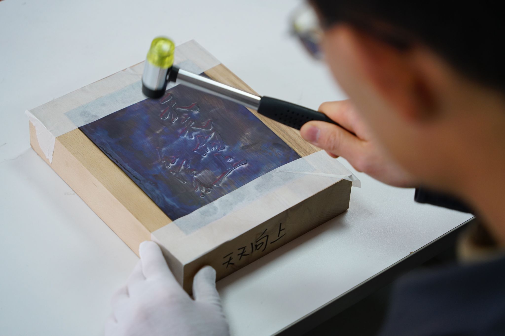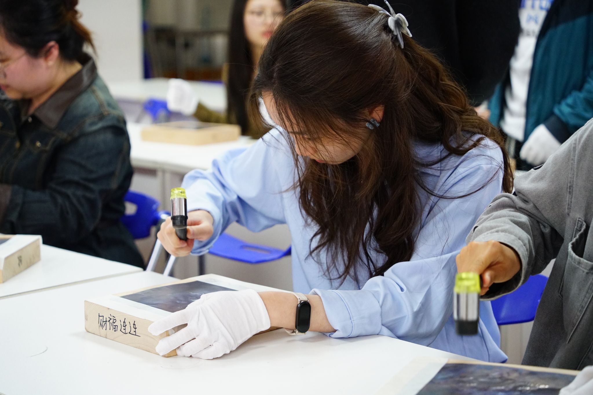 在非遗实践环节,参与者们0.2毫米厚度的铜片上拓印出融合传统纹样与现代审美的图案,“12生肖”、“美好祝语”样式的图案永久定格在铜板上。提神醒脑、安神助眠、驱蚊防疫,大家根据自身需求制作不同配方的中药香囊。栩栩如生的绿游锦鲤、色彩丰富的敦煌壁画、温馨明媚的落日夕阳,每一把漆扇都是一件独一无二的艺术品。