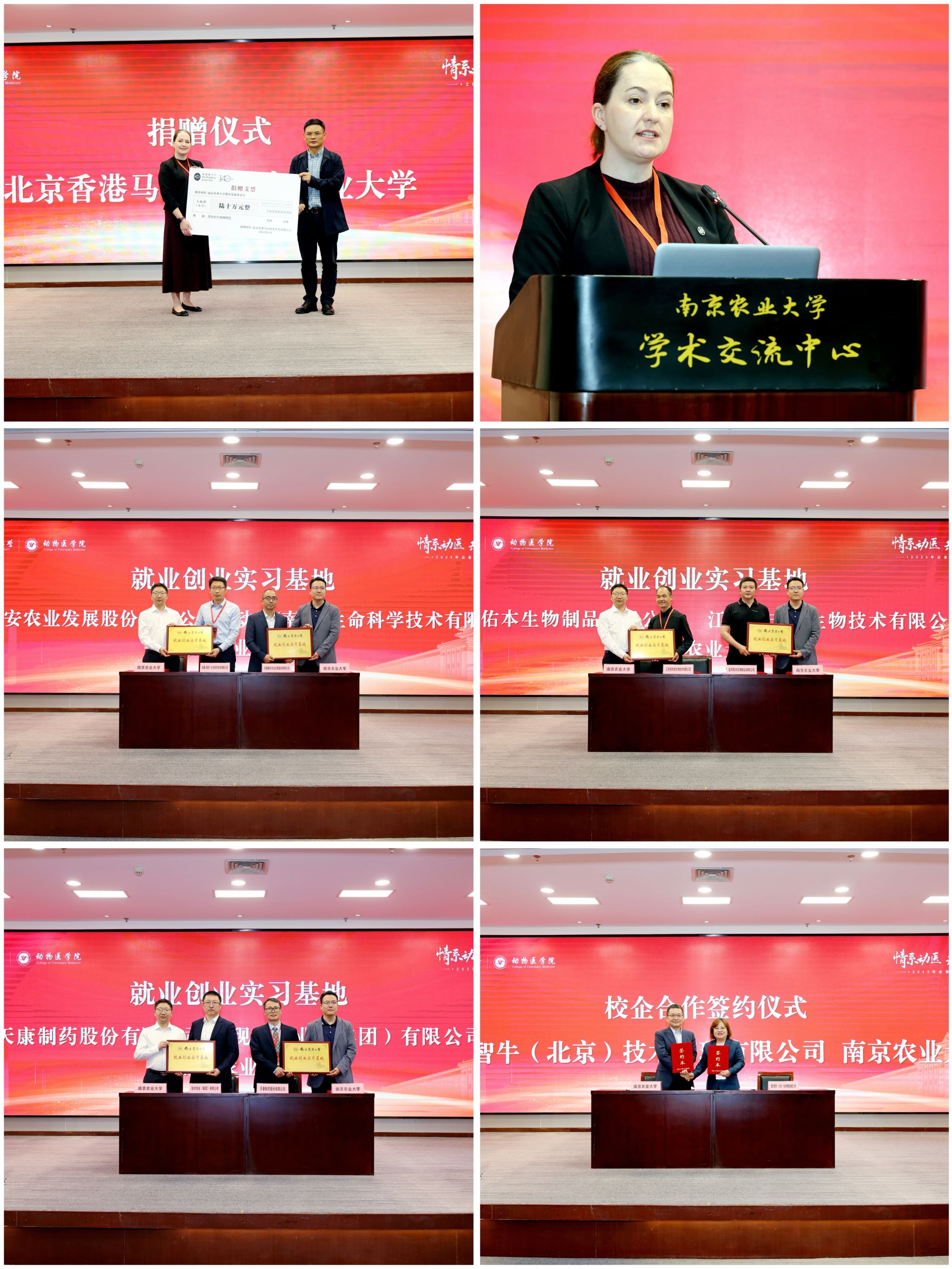会上进行了北京香港马会技术开发有限公司捐赠仪式、安徽顺安农业发展股份有限公司等六家企业就业创业实习基地签约暨授牌仪式以及现代智牛(北京)技术管理有限公司校企合作签约仪式。Parkes博士作为企业代表发言,她表示将为伟德betvlctor体育官网人才培养提供更多优秀教育资源,关注并支持兽医人才培养,期待共同推动兽医学科进步。
