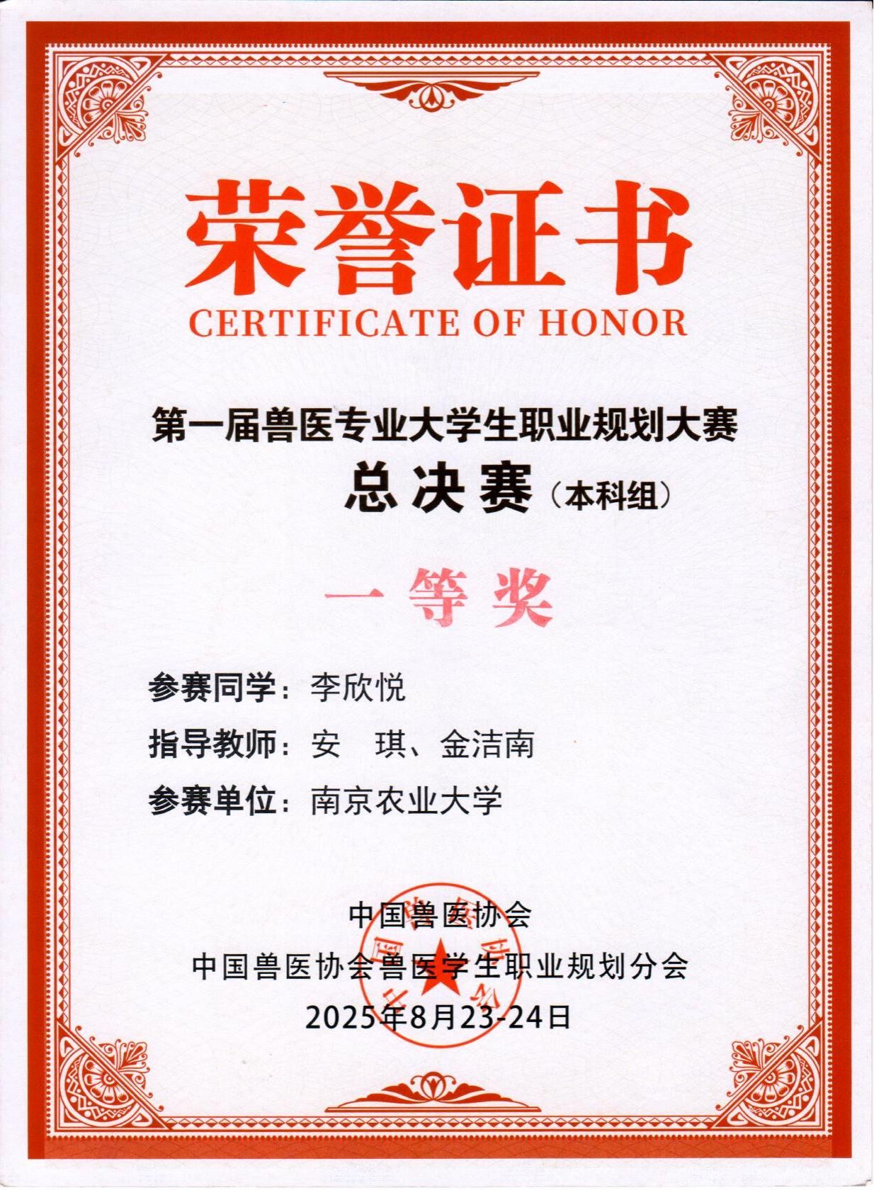 代表我们参赛的动医234班李欣悦同学,凭借清晰的职业规划、扎实的专业知识、出色的现场发挥和沉稳的答辩表现,在全国总决赛中脱颖而出,荣获本科组一等奖,展现了我们学子卓越的综合素质和昂扬的精神风貌。
