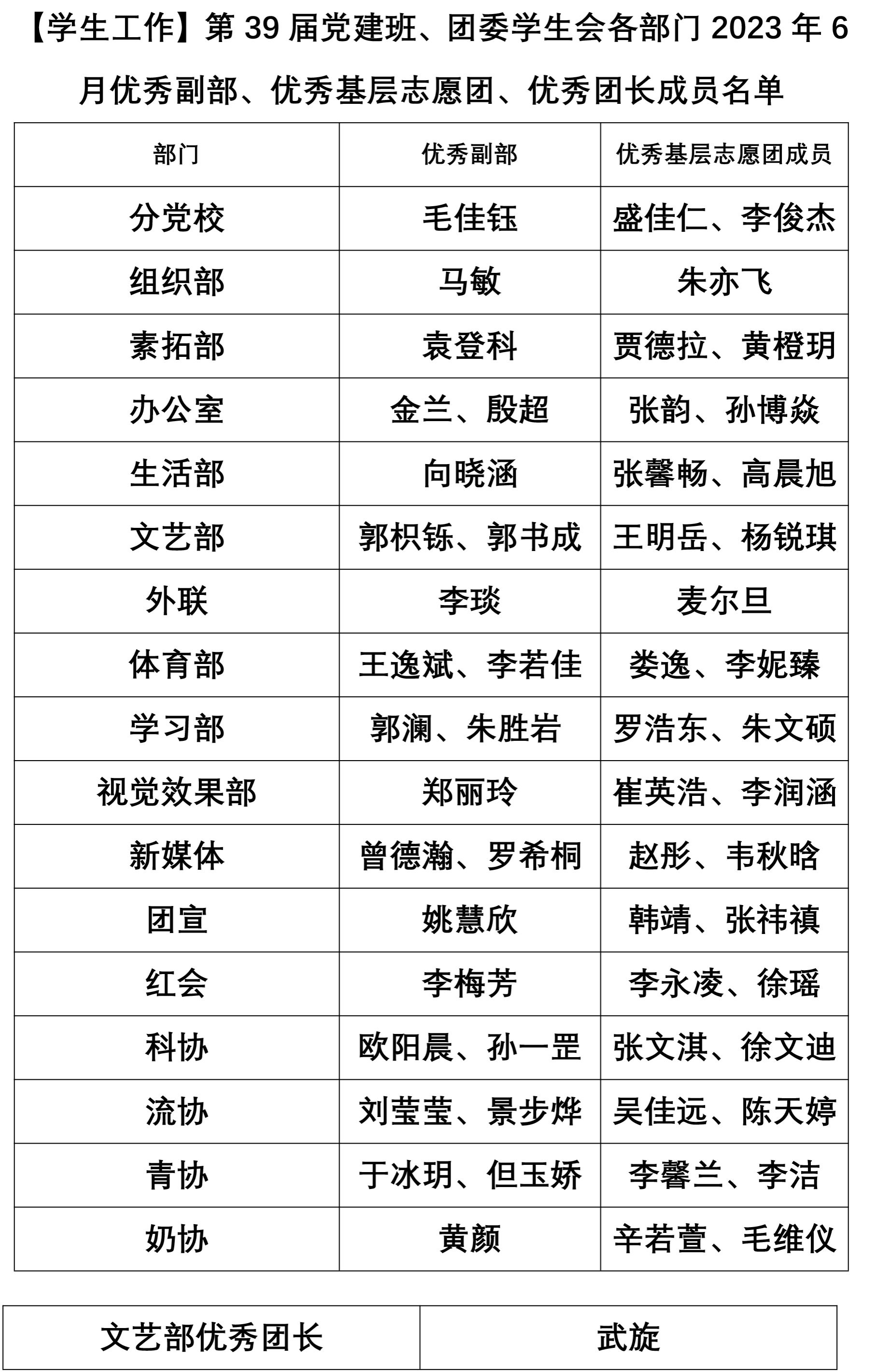【学生工作】第39届党建班、团委学生会各部门2023年6月优秀副部、优秀基层志愿团成员、优秀团长名单
