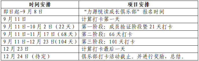 第一阶段(21天打卡):请加入俱乐部的成员,需要完成累计21天的阅读打卡,每天需要至少阅读30分钟,打卡的具体操作建议为:每人每天阅读之后需要在“力源悦读成长俱乐部”的QQ大群中和自己小组的QQ群中,发表100字左右的“阅读进展及读书心得”(当天晚上22:00前),供大家交流讨论。如因特殊情况需中断(不超过1天)的成员,需上报组长,并经过俱乐部部长同意。本阶段有1天“懈怠时间”。累计2天及以上中断,则需从第1天重新计算,阅读打卡操作参照第一阶段打卡。