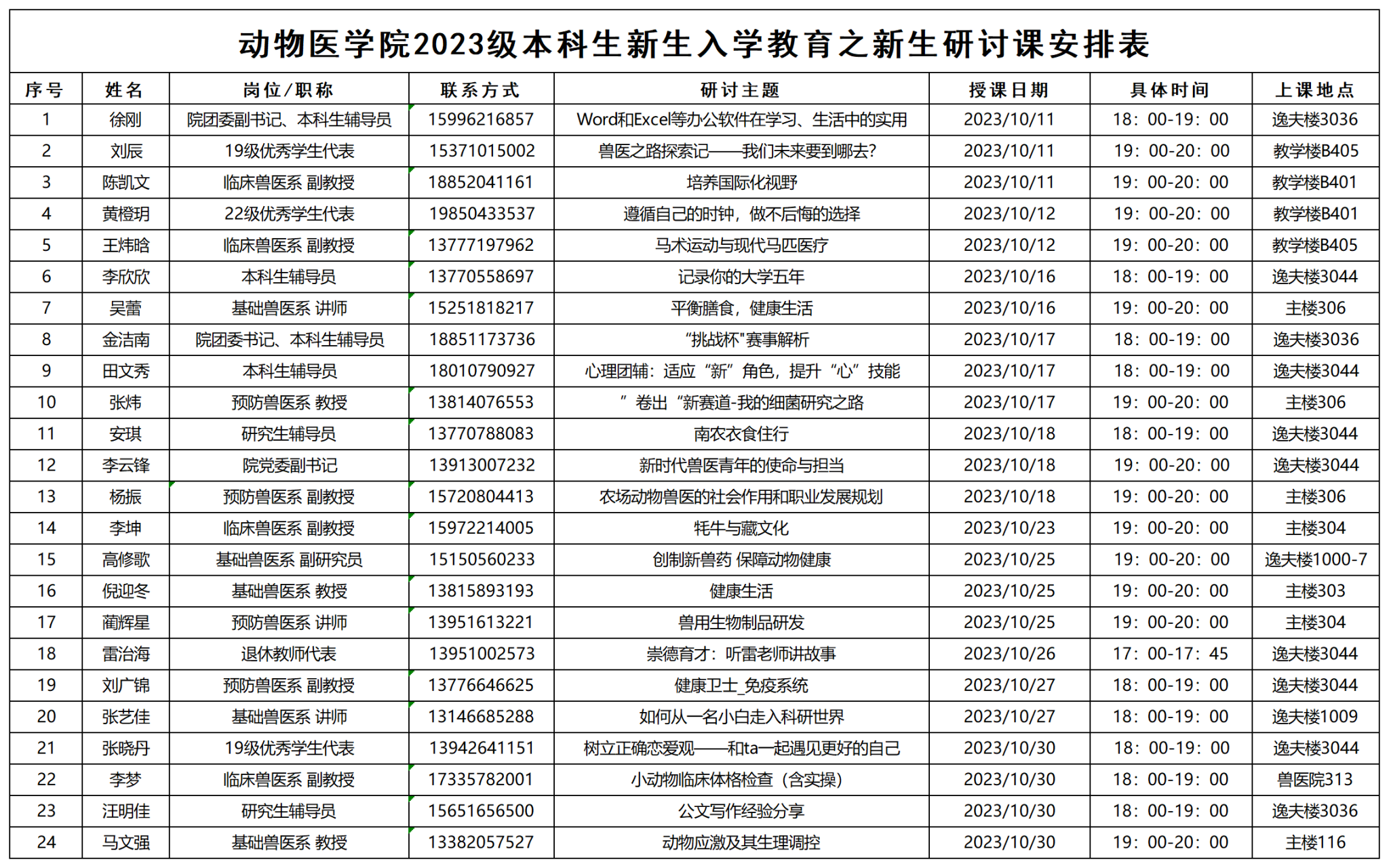 新生研讨课作为本科新生的开学第一课,旨在通过深度交流与互动构建师生沟通的桥梁,扣好大学生活的“第一粒扣子”。此次,学院邀请了二十一名授课教师及三位优秀学生代表,旨在使同学们全面、客观的认知动物医学、动物药学专业,多维度认知兽医行业发展,清晰未来规划,并启发学生的研究和探索兴趣,使同学们更好、更快适应新环境,开启丰富多彩的大学生活。