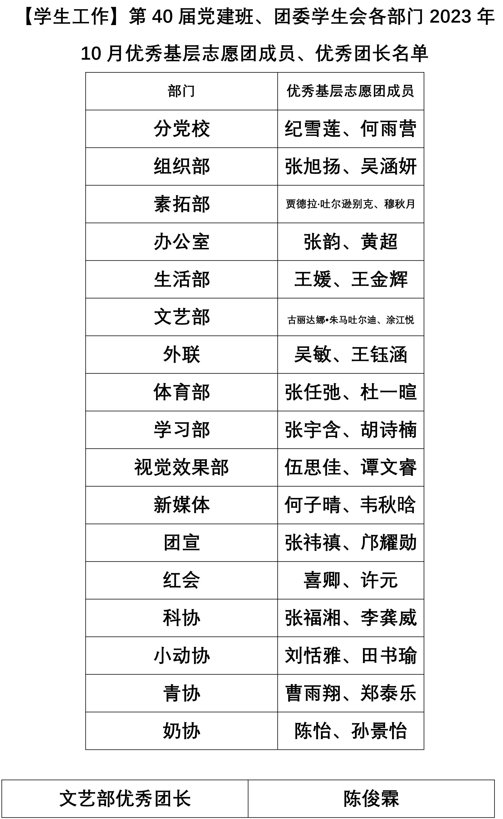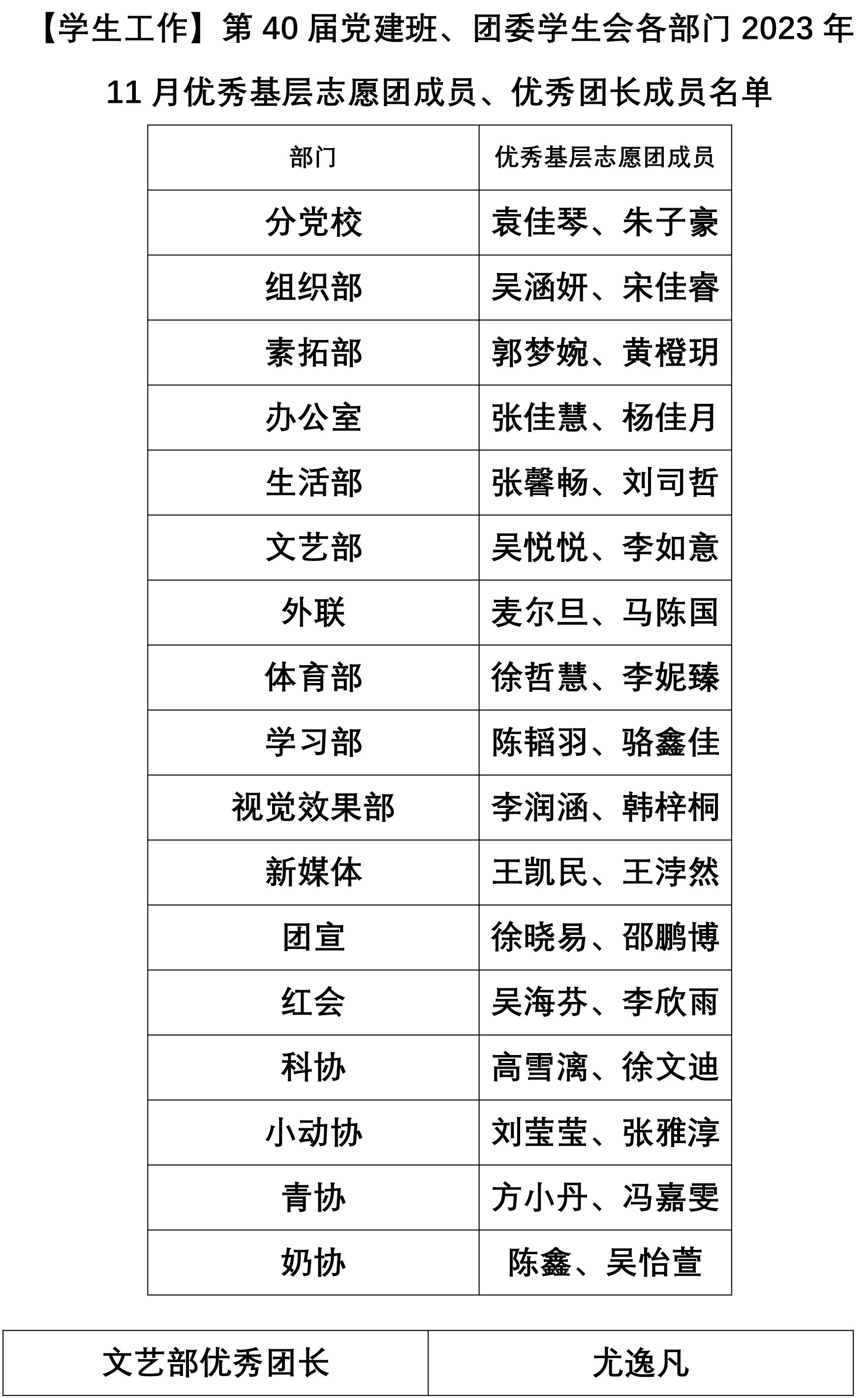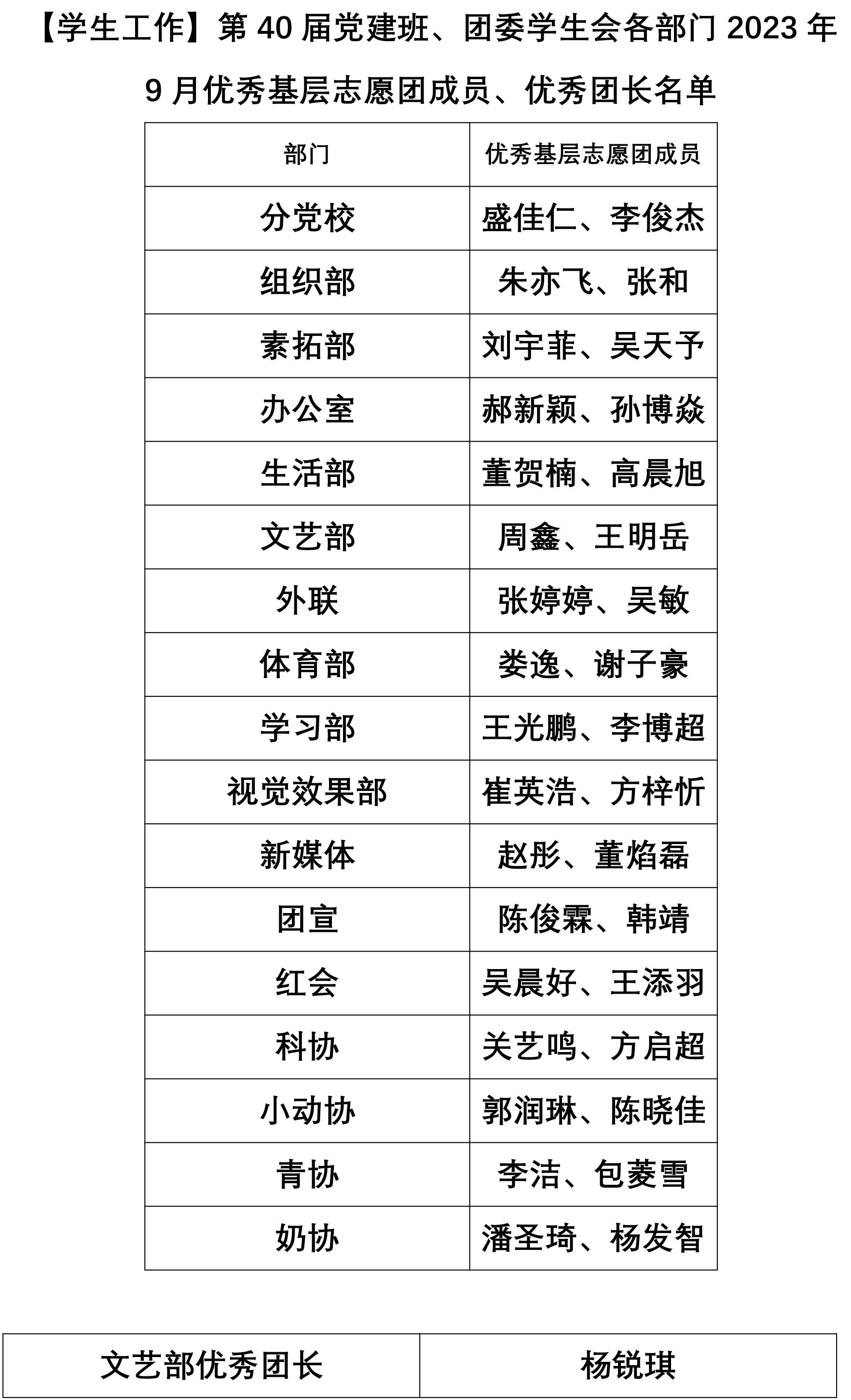 【学生工作】第40届党建班、团委学生会各部门2023年9、10及11月优秀基层志愿团成员、优秀团长名单