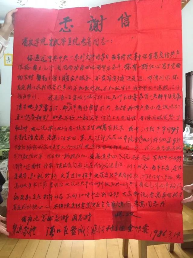 由于那个时候包产到户,三户人家管一头牛,牛是轮流照顾,每过一个礼拜牛就由下一户人家饲养,而由于偷吃粮食后要隔48-72小时才会出现症状,这牛在上一家偷吃后还好好的,并未发病,两三天后转到下一家后就发了病。由于害怕承担责任,便没有把牛偷吃的事说出来。最后高老师通过第三胃注射,很快便使牛痊愈了。事后那农户还给高老师寄了一封写在大红纸上的感谢信,说到此高老师告诉我们,他至今还保留着这封信,一会儿拿给我们看,不难看出高老师是有多么地珍惜这封信,而在我们看来,高老师更珍惜的是这份回忆,这段不寻常的经历,这份与农民的情谊。
